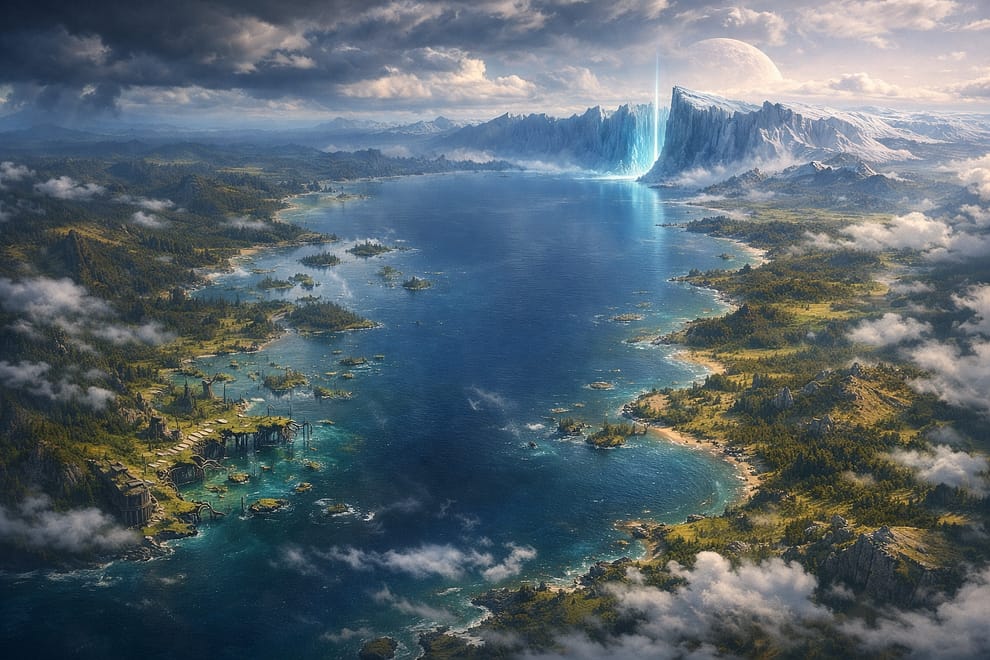 Birthplace of mankind and an abandoned realm, Ephera is what amounts to a nearly endless coastline. The ring shape of this watery world encompasses the entirety of the ice realm Plaith, who’s waters below are the same as those that cover much of the shallow coasts of this realm.