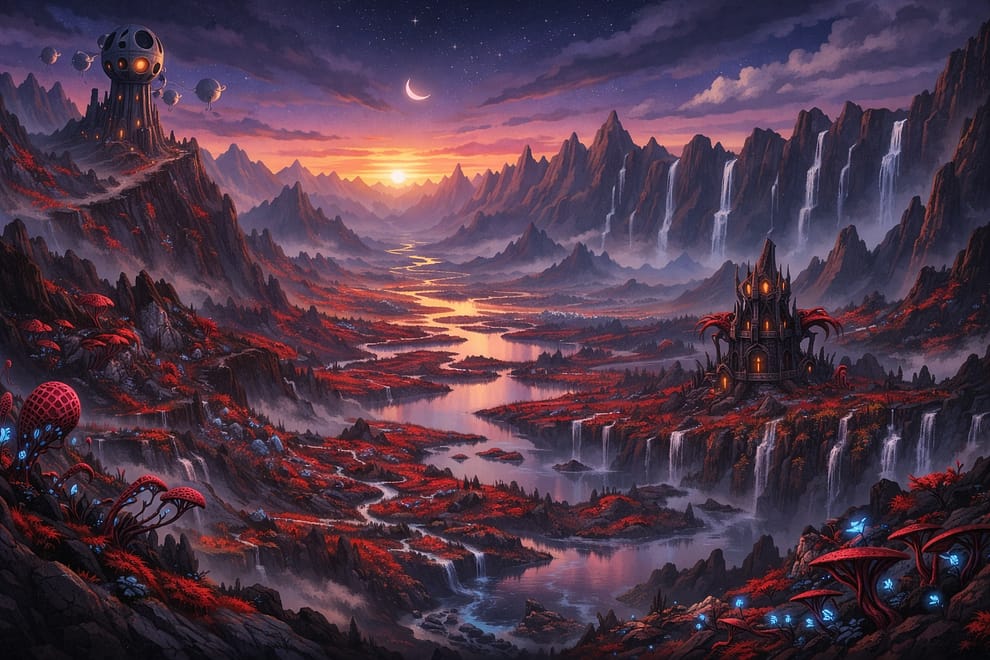 This location in the vast cosmic landscape has rendered this world a place masked in an eternal twilight, illuminated entirely by the reflective lights of the passing luminaries of Verrena’s astral gateway high overhead. As well the high winds and cold air of the cosmic mountainside produces a uniquely hardy biology, including the bodies of the Aessemors. The plants and animals native to Mahgentra are typically dark shades of red, blue, and/or purple. If not outright black, which often comes to dominate the psyche of the people who depict their world often through silhouettes alone.